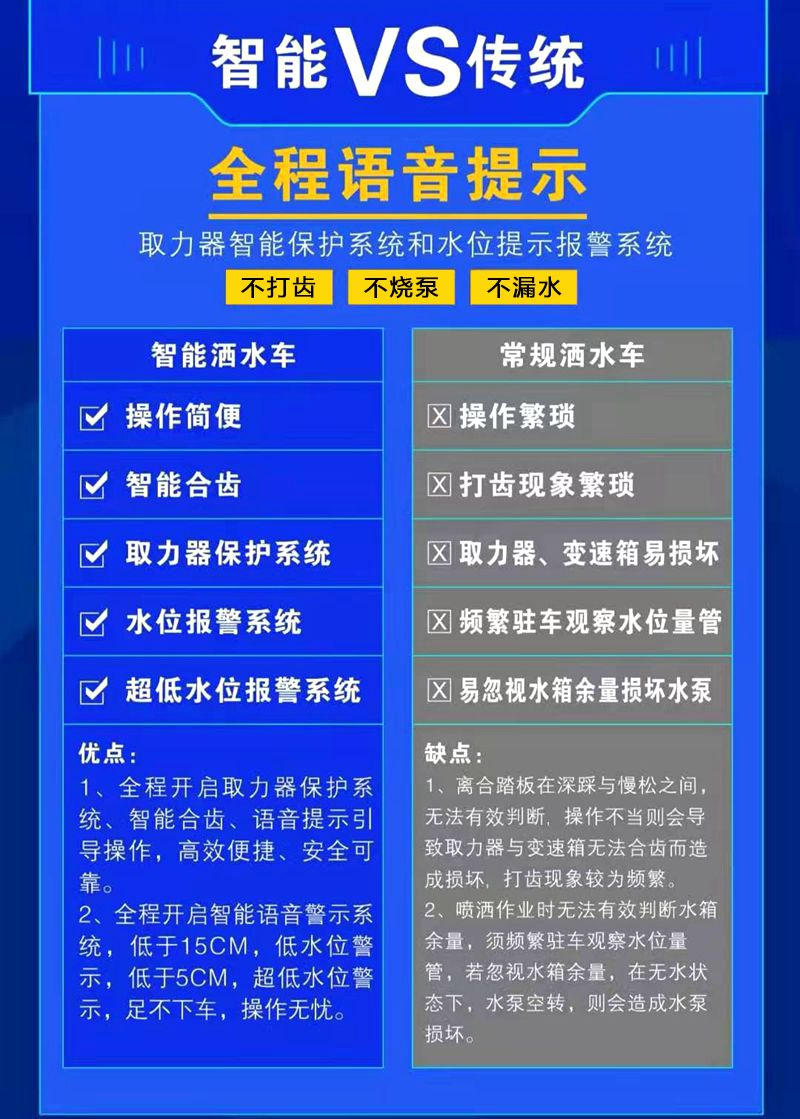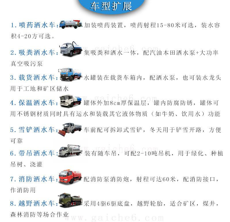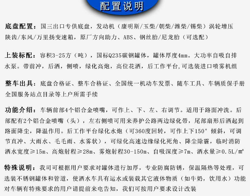 通径双层工程大梁,7.50轮胎。标配前冲,后洒,侧喷,高炮,高炮可调节成花洒状,毛毛雨状,或柱状,射程可达到28米-32米,侧喷可覆盖8车道